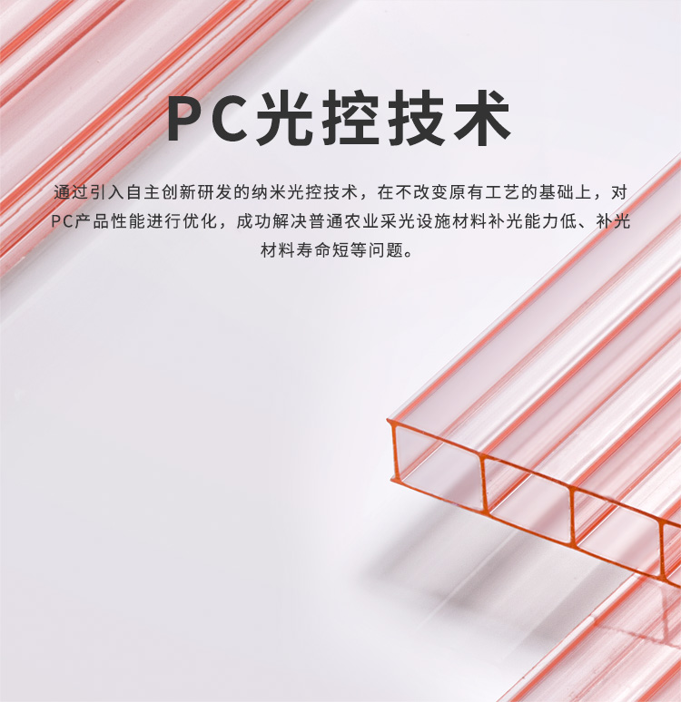 使用光控技術(shù)的PC板不僅具有壽命長、防流滴、防霧等功能,并兼具冬季高保溫,夏季高隔熱的溫控性能。使用品誠PC光控板建造的大棚可以有效縮短農(nóng)作物生長周期、提高農(nóng)作物產(chǎn)量和提升品質(zhì)。它還具有防蟲的作用,減少病蟲害,大大減少農(nóng)藥的使用。