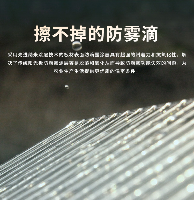 - 將納米顆粒加入到防滴露表面涂層中,使得含有納米針狀結(jié)構(gòu)的防滴露涂層與陽光板(聚碳酸酯)分子更緊密地結(jié)合在一起