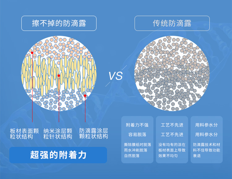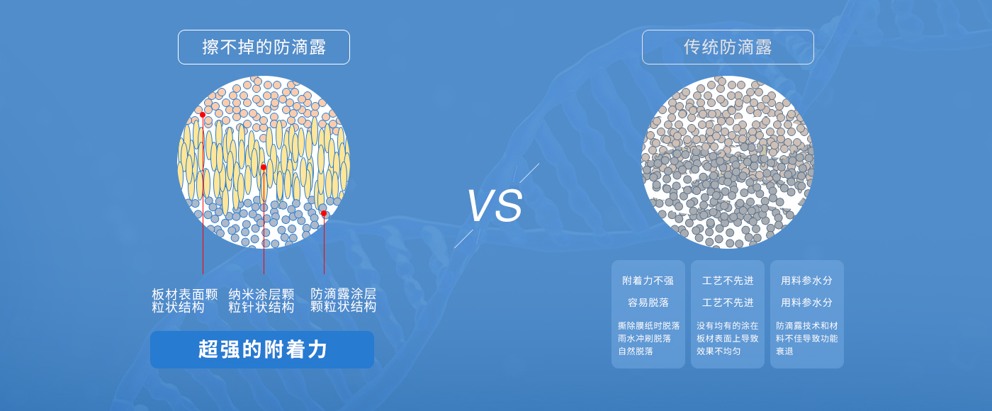 - 將納米顆粒加入到防滴露表面涂層中,大幅提高板材防滴露涂層的結(jié)構(gòu)穩(wěn)定性、耐水洗性、附著力、光潔度,從而不易脫落。