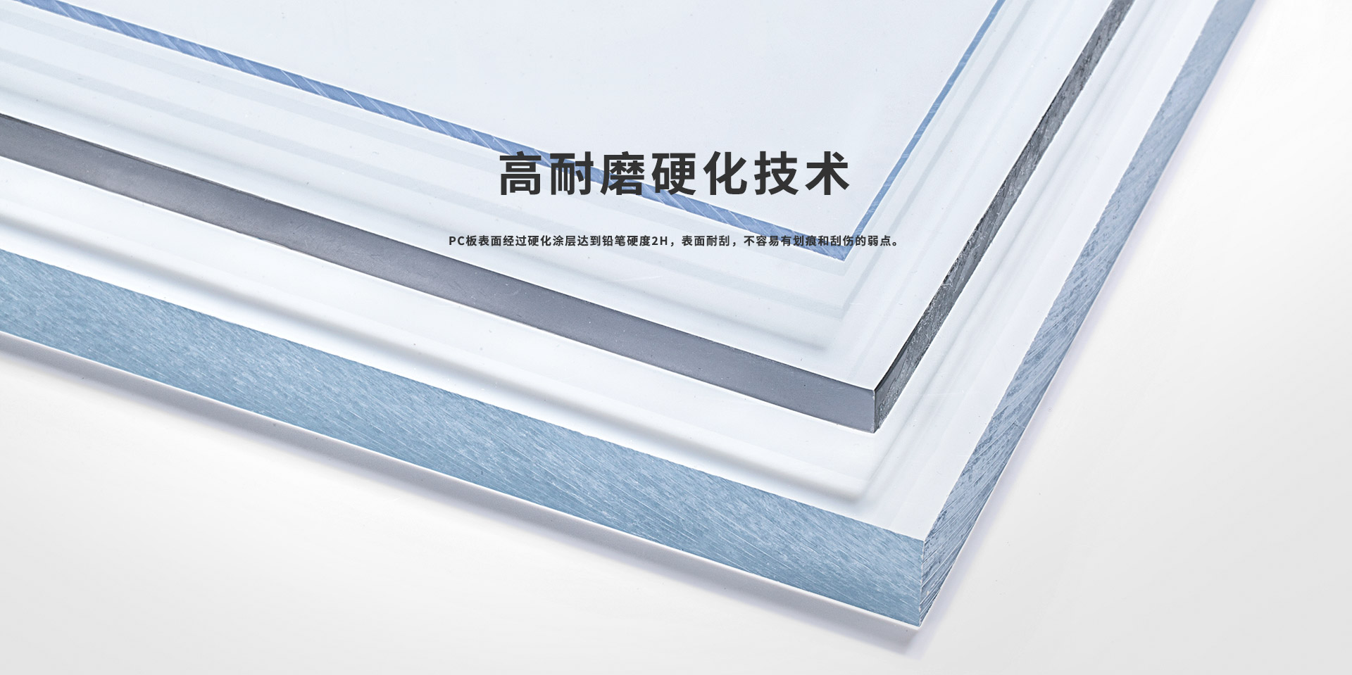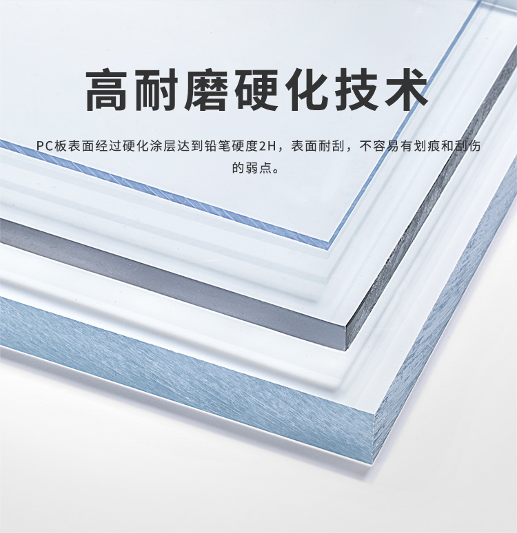 通過對PC板表面涂覆一些耐磨含硅成分的硬化涂層來增加硬度,在普通的PC耐力板基材表面做淋涂加工,在其板面附著硬化涂層,再經(jīng)過干燥處理表面達(dá)到鉛筆硬度2H,從而使得板材表面耐刮花,不容易有劃痕和刮傷;結(jié)合長效抗UV技術(shù),同時(shí)提供高耐磨和長效耐候的性能,并提供多種色彩、尺寸和結(jié)構(gòu)的產(chǎn)品組合。