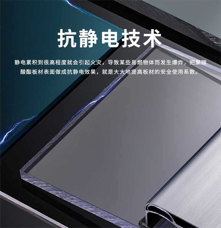 品誠防靜電PC板是以聚碳酸酯為基材,通過加入具有導(dǎo)電結(jié)構(gòu)的高分子永久靜電劑在PC樹脂內(nèi)部形成完整連續(xù)的靜電耗散分子網(wǎng),能快速轉(zhuǎn)移板材上的電荷,由于抗靜電劑是最高分子聚合物,均勻分散于PC基材中,不發(fā)生遷移,不受環(huán)境濕度的影響,從而帶來永久抗靜電的效果;以達(dá)到防止灰塵積聚,避免靜電危害的目的,來滿足高科技時(shí)代產(chǎn)業(yè)界的特殊需求。